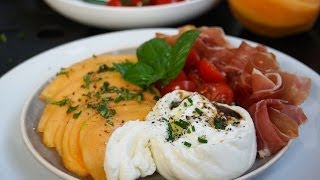 Cuisine : assiette estivale melon, burrata, jambon bellota